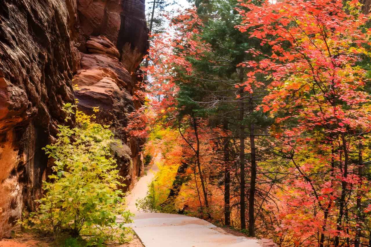 Cascading waterfalls, hanging gardens, and mixed foliage (cottonwoods, maples) around emerald pools offer variety and shade in a half-day hike—great for combining water features with autumn hues.